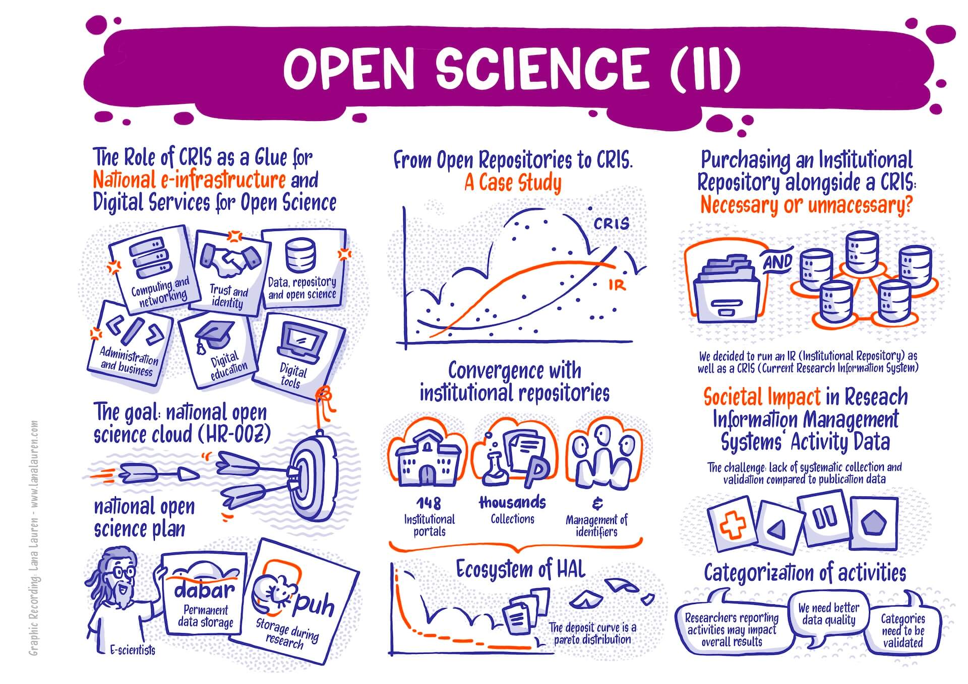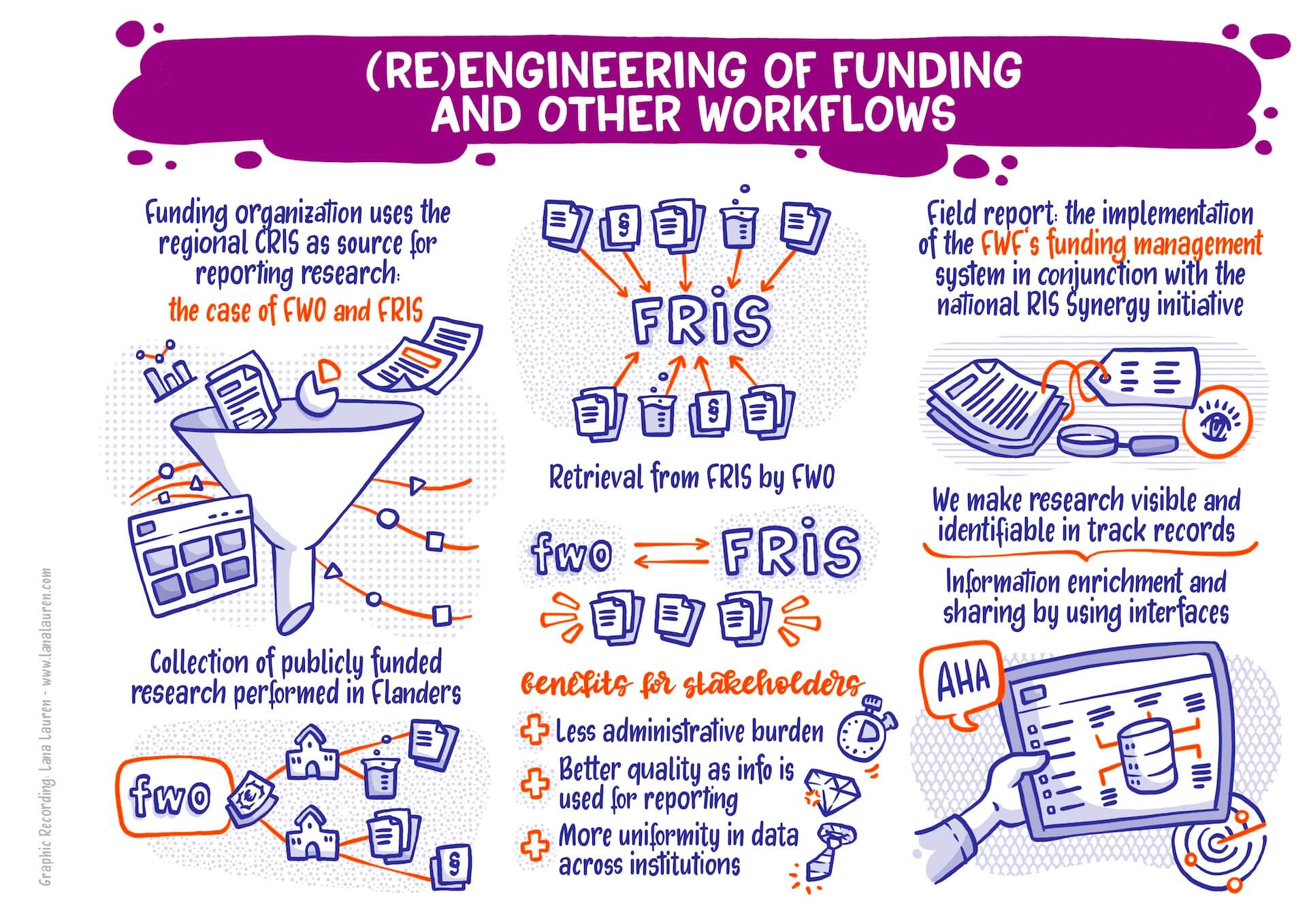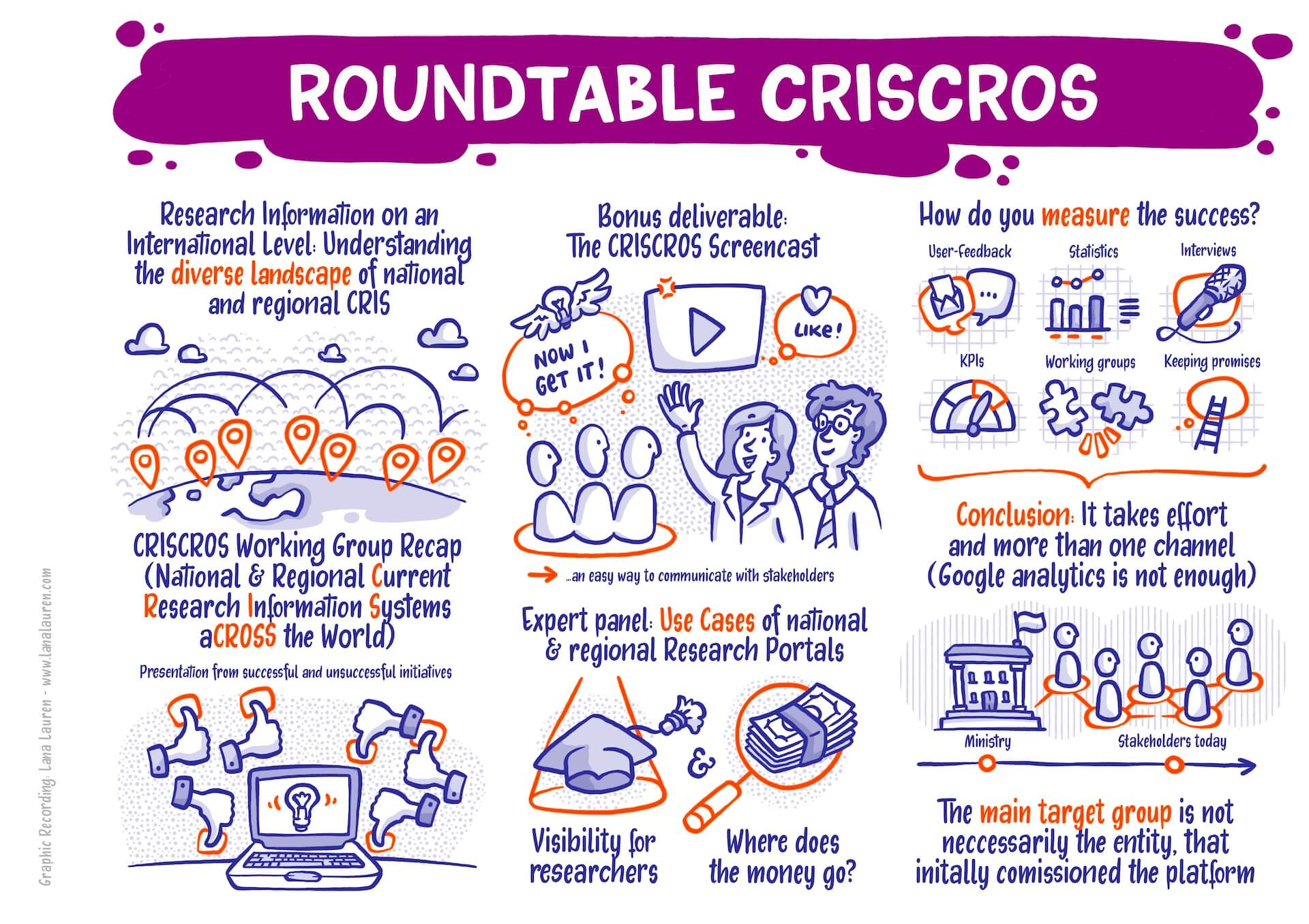 My Graphic Recording visually captured the key points of the presentations and discussions. The vivid illustrations helped participants grasp the really very complex and abstract topics as well as the exciting discussions with panelists from many different countries at a glance. It was an exciting and challenging task that more than paid off: it was fascinating to see how the latest developments and ideas in the world of research information systems were presented and discussed.