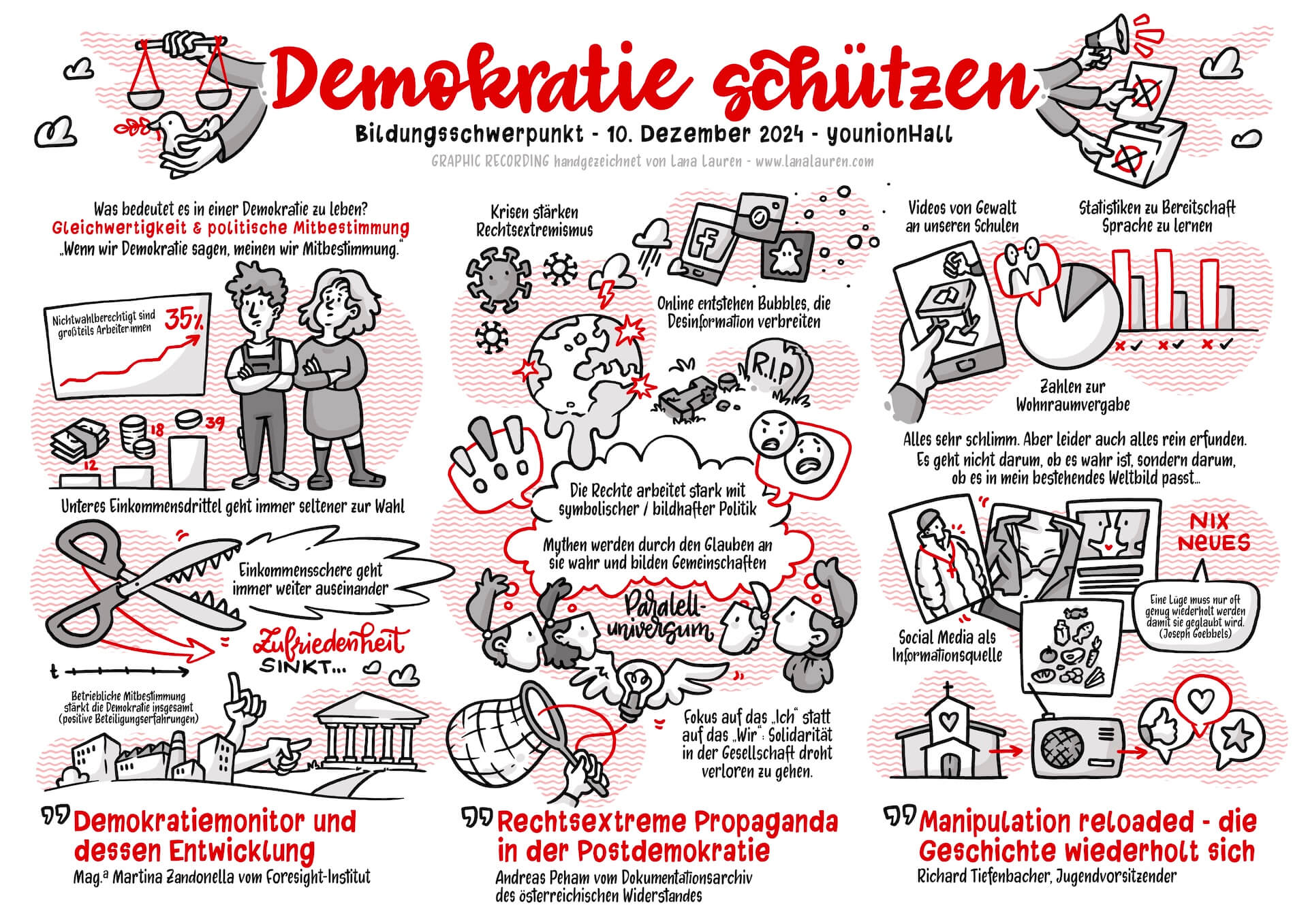 At the event “Protecting Democracy,” I had the opportunity to visually capture the inspiring lectures and discussions through my graphic recording. The event provided exciting insights into the challenges and opportunities for democratic processes in Austria and Europe.
