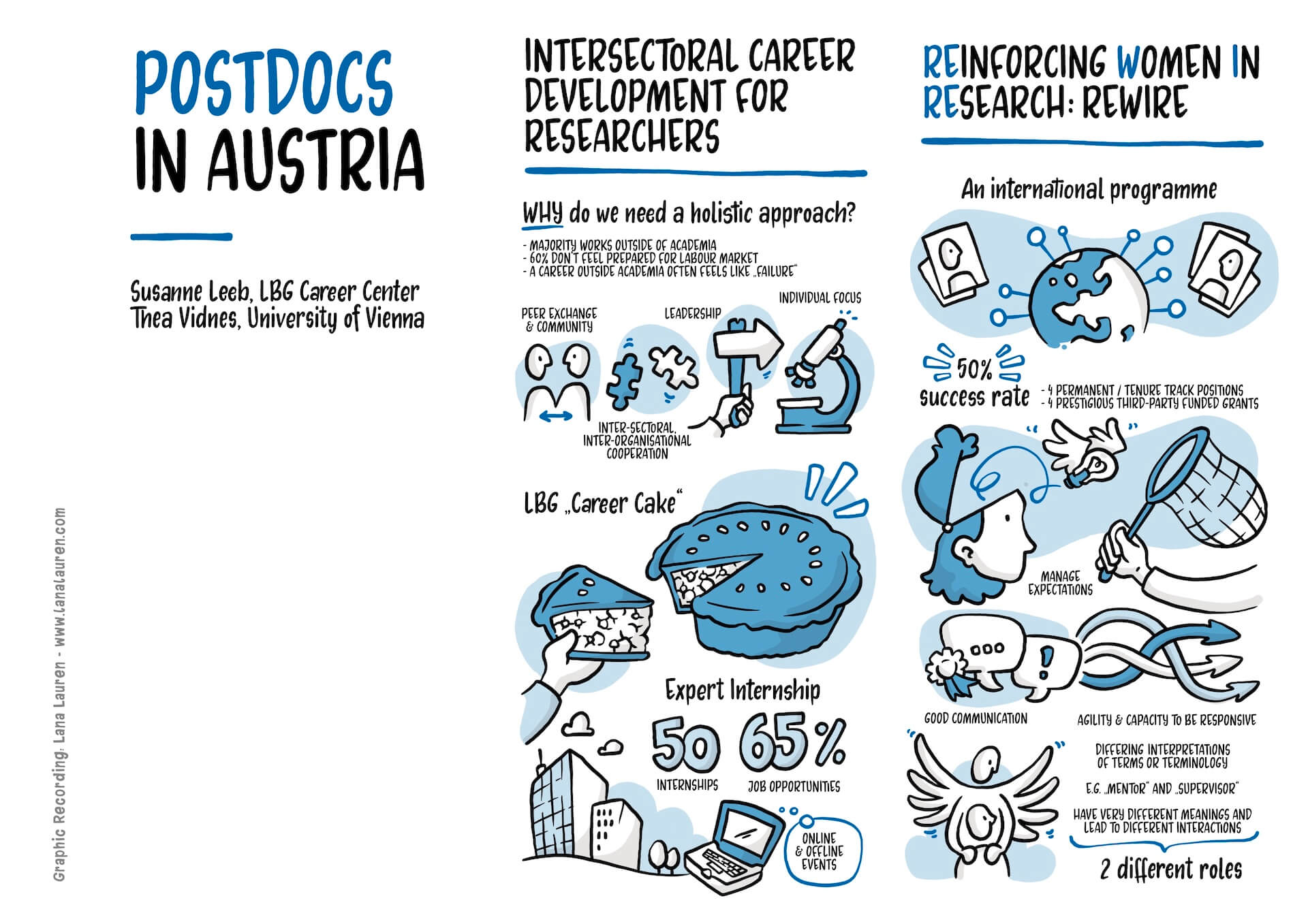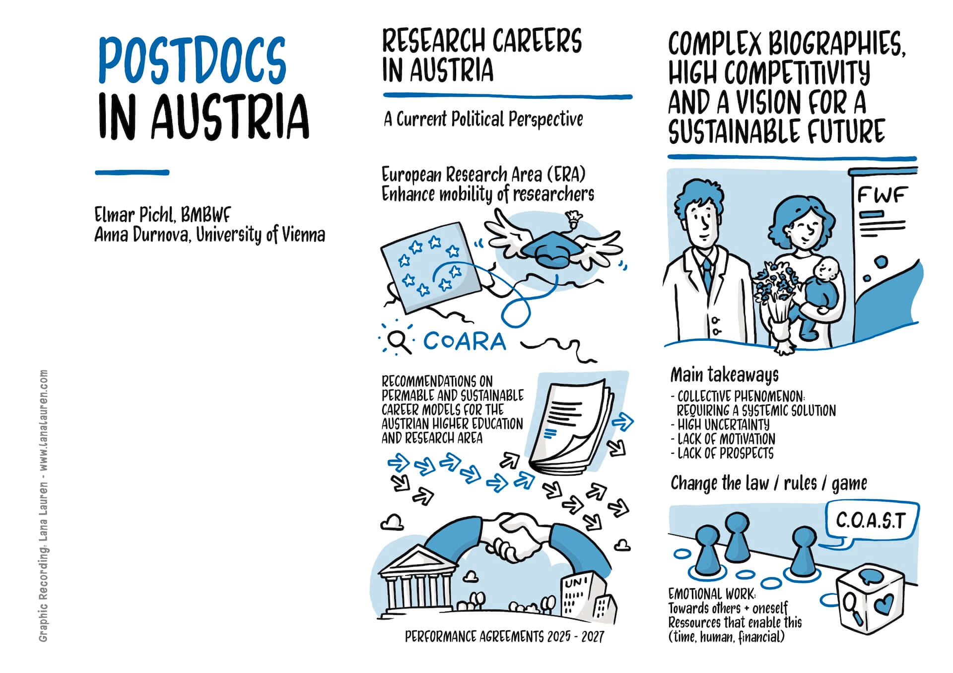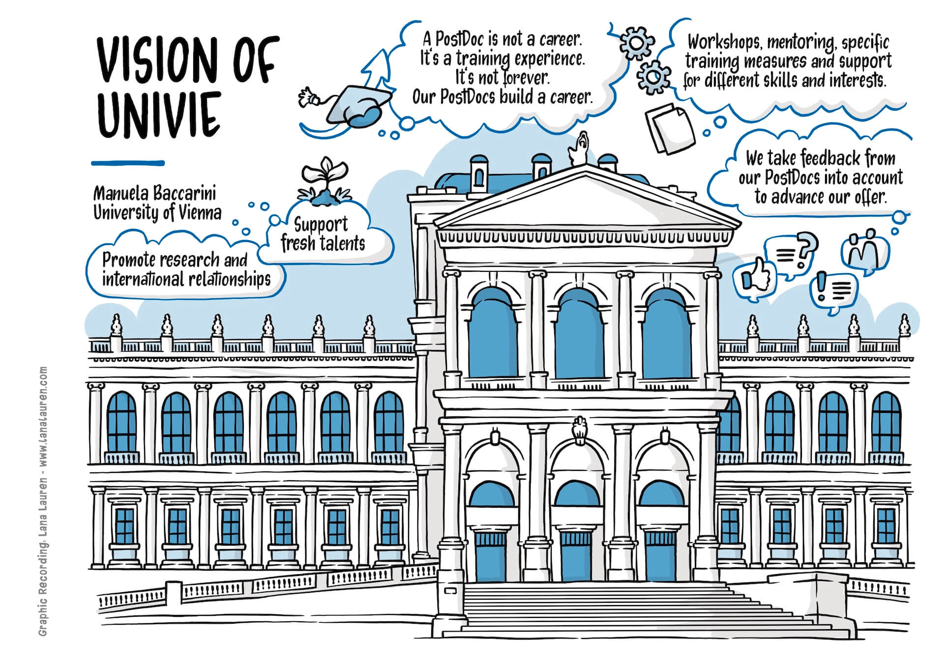 I found the vision of Vice-Rector Manuela Baccarini, to support Postdocs with tailored career offerings, particularly inspiring. A definite highlight was the statement “Being a Postdoc is not a Career” – a strong message. The international best-practice examples from London and Leuven also impressed me and provided discussion material, which I made visually tangible along with the presented concepts. The discussions about the situation in Austria and the political framework conditions also showed how much potential this topic holds. I captured all these ideas in my visuals and hope they help to make the University of Vienna’s vision for Postdocs vivid and lively.