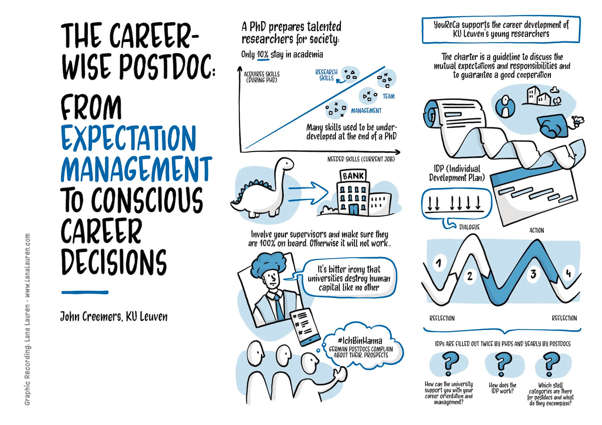 The Postdoc Conference at the University of Vienna was a wonderful opportunity for me to visually capture exciting ideas and discussions surrounding the questions, needs, and challenges of Postdocs and to dive into the topic. The conference took place on June 10th in the beautiful Sky Lounge of the university with a view over all of Vienna. I was there live, and my pen barely stood still – so many interesting impulses!
